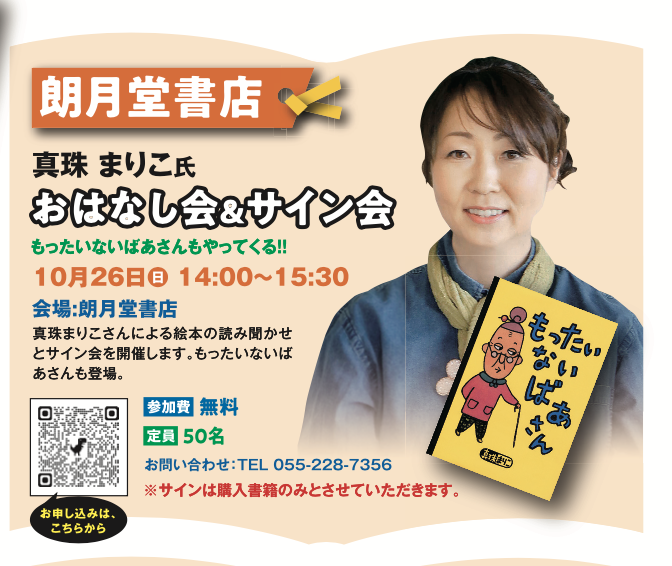 山梨県甲府市にて絵本のおはなし会があります。 出演:真珠まりこ、もったいないばあさん ●2025年10月26日(日) 14:00〜15:30 入場無料 at 朗月堂書店 山梨県甲府市貢川本町13−6 TEL 055- 228-7356